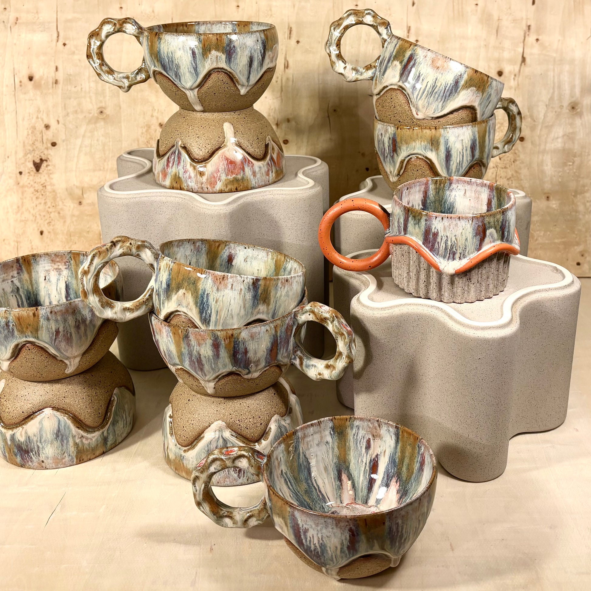 These carved wheel-thrown ceramic bowls with multi wavy drip pattern are colored with a variety of glazes that remind me of rhubarb and strawberries. The glazes form a beautiful flower on the inside which makes eating your favorite cereal/ice cream/soup a delightful experience.